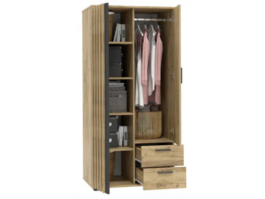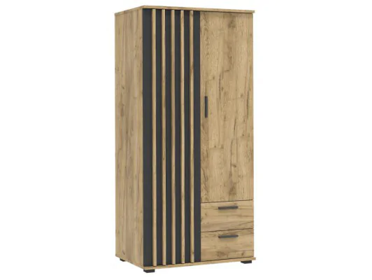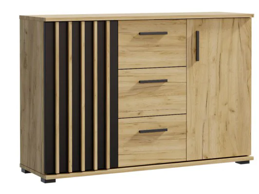 Cechą wyróżniającą mebli MONTANA są modne pionowe lamele, które dodają nowoczesnego charakteru i świetnie współgrają z kolorystyką czarny + dąb craft. Każdy element zestawu to funkcjonalność, trwałość i styl.